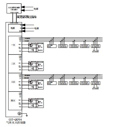 GST-QKP04可帶4個區的氣體滅火設備,實現對4個防護區的保護;GST-QKP04/2可帶2個區的氣體滅火設備,實現對2個防護區的保護。其中每個區所帶設備及數量如下: