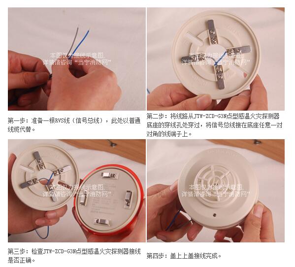 第二步:將線路從JTW-ZCD-G3N點(diǎn)型感溫火災(zāi)探測器底座的穿線孔處穿過,將信號總線接在底座任意一對對角的線端子上。